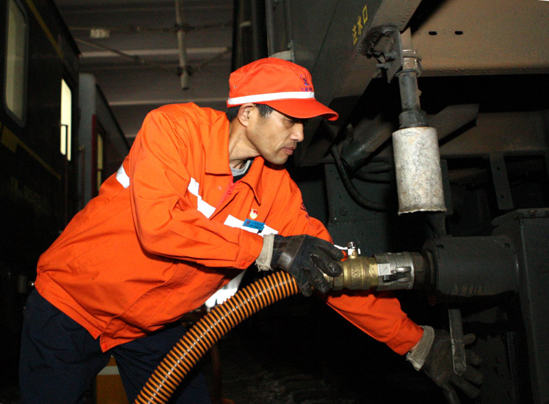 楊益勤在一絲不茍地執行列車卸污操作程序 插上卸污管,扣好保險耳,依次打開三個閥門,耳聽手拈判斷吸污進度;快步輕履似競走選手,手起手落如行云流水……春運中,49歲的上海站卸污工楊益勤冒著刺骨的“穿堂風”在狹窄的股道間為列車卸污!傲熊嚲拖袷切律鷥,我的工作就是幫列車‘排大便’‘…