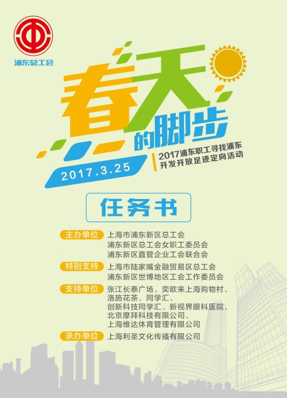由浦東新區總工會、浦東新區總工會女職工委員會、浦東新區直管企業工會聯合會共同主辦的“春天的腳步——2017浦東職工尋找浦東開發開放足跡定向活動”,將于3月25日上午在陸家嘴中心綠地開跑。 一、活動時間、地點 開始時間:2017年3月25日早上8:30——10:00 開幕地點:浦東陸家嘴中…[詳細]