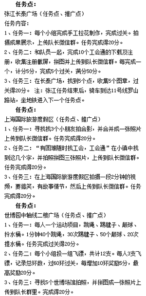 一、起點: 陸家嘴北濱江親水平臺(開幕式、頒獎) 任務內容: 1、任務一:尋找12棟陸家嘴地區的高樓,拍照后拼圖,4個為一張照片,共3張照片。上傳到工會通所屬隊伍的專屬專欄。 2、任務二:尋找9個銀行名稱,不能重復并拍照,9張照片拼成1張照片,上傳到工會通所屬隊伍的專屬專欄。 3…[詳細]