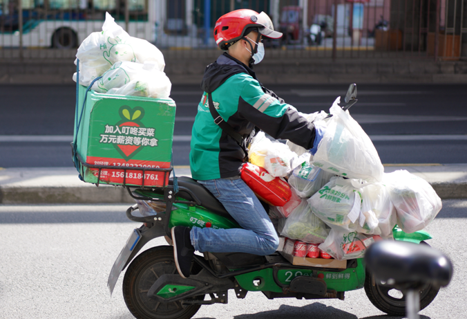 叮咚買菜的快遞員正在送貨。 受訪者供圖
