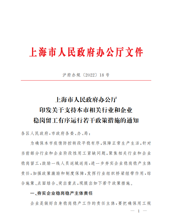 上海印發“關于支持本市相關行業和企業穩崗留工有序運行若干政策措施”的通知。來源:上海市政府官方網站。