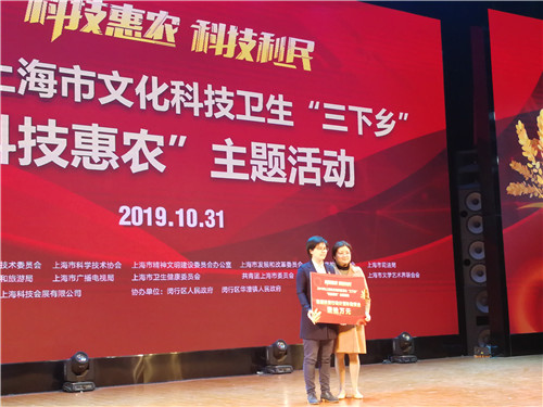 市科委向閔行區華漕鎮贈送50萬元科技大禮包,科技大禮包由多功能生物肥料、種子種苗、科普書籍等組成。
