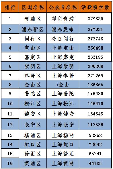16區活躍粉絲數前十分別為:青浦區、浦東新區、閔行區、寶山區、嘉定區、崇明區、奉賢區、金山區、普陀區、松江區。