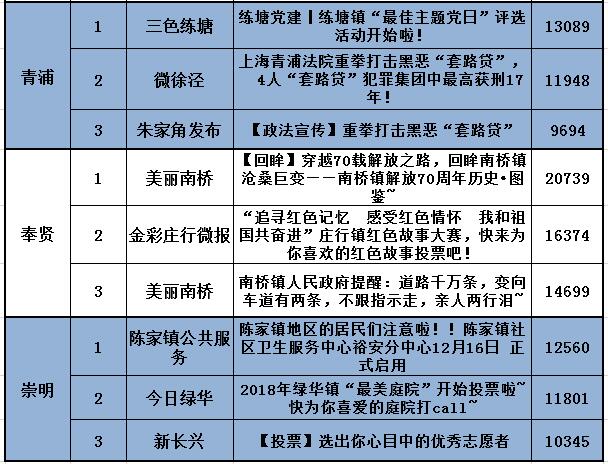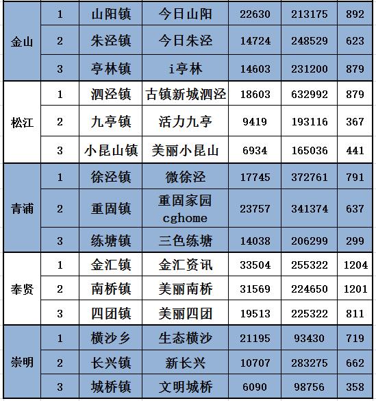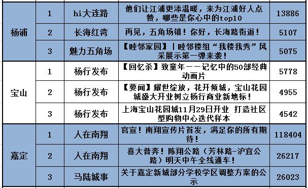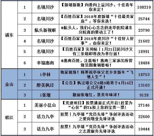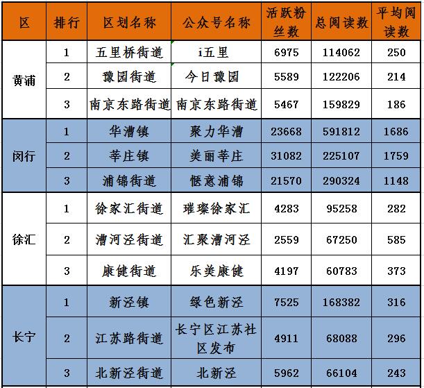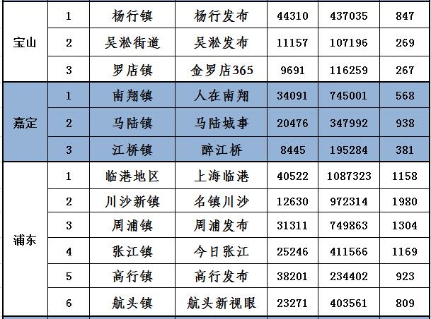 按照活躍粉絲數,寶山區楊行鎮“ 楊行發布”,榮登榜首;按照總閱讀量,浦東新區臨港地區“上海臨港”,一枝獨秀;按照平均閱讀量,浦東新區川沙新鎮“名鎮川沙”,則拔得頭籌。