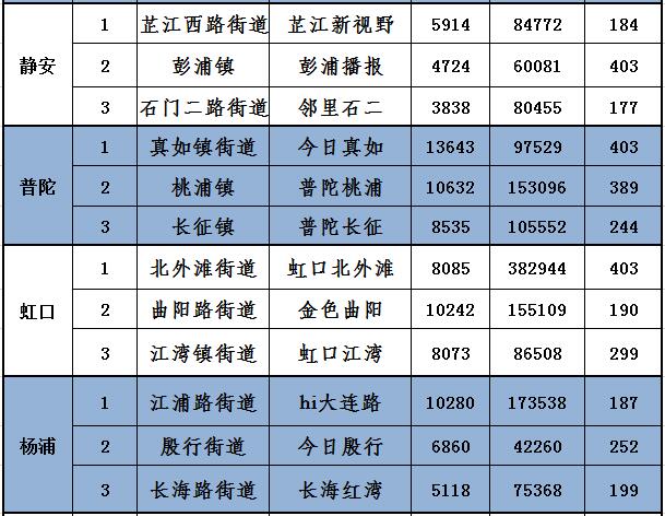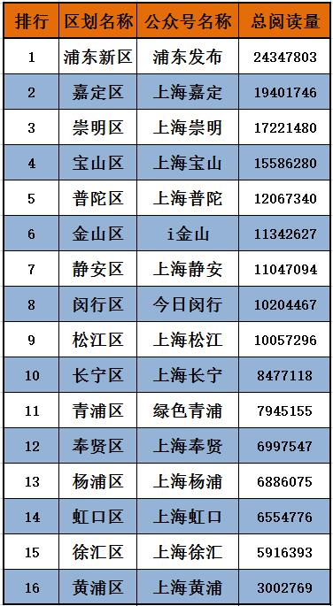 總閱讀量前十分別為:浦東新區、嘉定區、崇明區、寶山區、普陀區、金山區、靜安區、閔行區、松江區、長寧區。