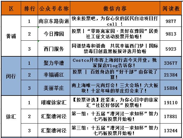 其中,閱讀量1W+文章共29篇,占總數的56%。另外,閔行區“聚力華漕”《Costco開市客上海閔行店今天開業,獨家探店Vlog告訴你!》、松江區“美麗小昆山”《【黨建項目】投票通道正式開啟!趕緊為“心儀”的TA投上您的寶貴一票!》、嘉定區“人在南翔”《陳翔公路(芳林路-滬宜公路)明天中午全線通車!》閱讀量排行分別位列第三、四、五名。