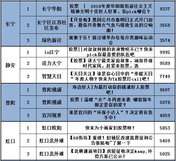 接下來就是比較直觀的各區文章前三甲。2019年,上海所有區公眾號中,兩篇文章閱讀量破10W+,分別是嘉定區南翔鎮“人在南翔”《官宣!南翔宣傳片首發,滿足你的所有期待》和浦東新區川沙新鎮“名鎮川沙”《【新鎮新貌】向善向上益川沙,十佳青年你來定!》,恭賀這兩家喜提10W+。