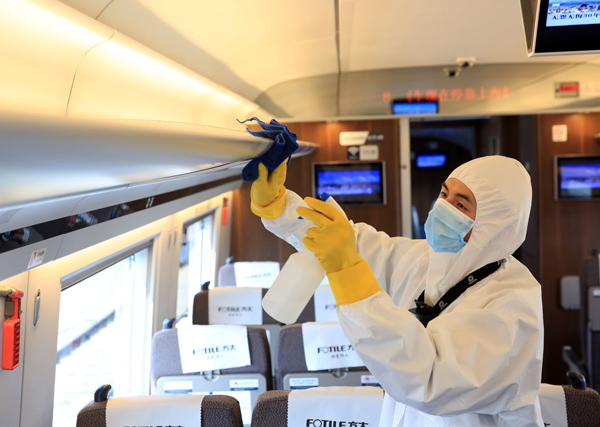 華鐵旅服公司專業人員做好高鐵列車車廂消毒工作。 趙金愛 攝