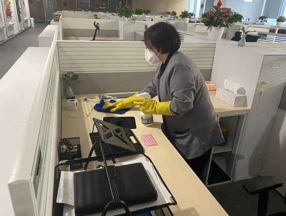 下午14:00,保潔員說:“給您工位消下毒吧”。我看她用84消毒液噴了地面,并把我的桌面擦了一遍。這一刻,我不禁感慨,為了今天的正常復工,這座城市,這幢樓,我們公司,有那么多的人在默默付出,盡職盡責,窮盡每一個細節,只為你我的安心。