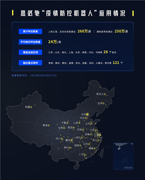 截至2月21日,“疫情防控機器人”已在湖北、廣東、江蘇、上海、四川、重慶、山東等全國28個省市區的近700個社區(行政村)推廣應用,累計呼出電話510萬通,其中互動式訪談通話260萬通,通知宣貫類通話250萬通,平均每天呼出量約24萬。