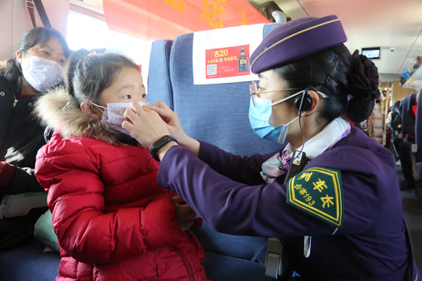 2月20日,約1000名阜陽及周邊地區務工人員乘G9413次返程專列前往義烏,圖為列車長為一名隨車小旅客戴好口罩。 梁浩然 攝