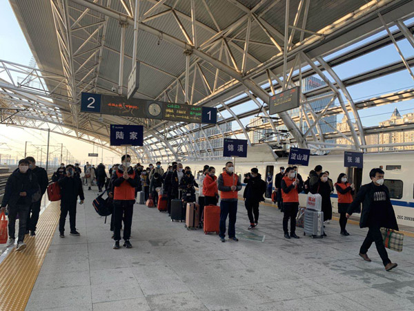 2月20日,300余名河南省務工人員乘G1915次返程專列抵達昆山市。 潘玲 攝