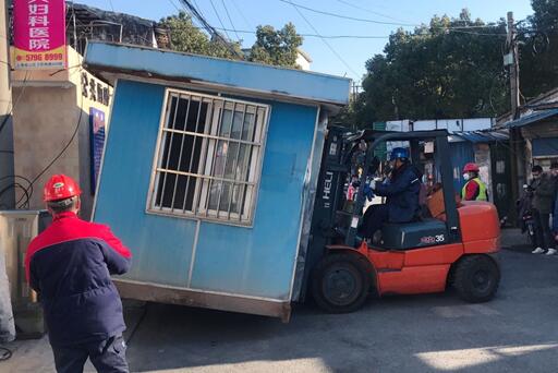 瞧了眼時間,又回頭看了看后面跟著的卡車和吊機,坐在車里帶路的龔家達松了一口氣。剛到兩點,看樣子太陽下山前應該能完成安裝。不過,好事多磨。到了金衛三組,大家都呆了:這是典型的城中村,出租房多、路口多、建筑亂,封閉管理后留的路口,頂上電線縱橫交錯,吊機又用不上了。
