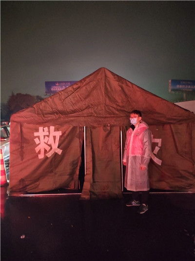 這天下著雨,格外陰冷,陳一飛一大早就趕到倉庫集合,一輛車由兩名志愿者負責。當他們到達第一個檢查站時,發現道口的警察、醫護人員和志愿者都忙于防疫檢查!耙,我們把帳篷搭好吧,下著雨,他們能早點有地方休息!标愐伙w和搭檔說干就干,由于事先沒有準備,兩人只能冒雨徒手“上陣”,帳篷很大很沉,他們又不夠熟練,整整花費了2個小時才把帳篷四平八穩地安裝好。他倆連口熱水都沒顧上喝,就馬不停蹄地趕赴下一個站點。