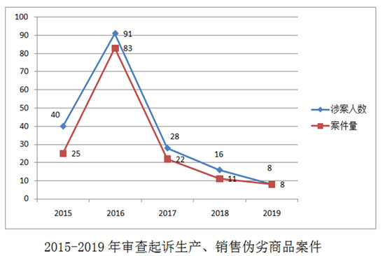 審查起訴生產、銷售偽劣商品案件總體呈下降趨勢,自2016年開始不斷下降,2019年同比下降37.5%,懲治效果顯著。