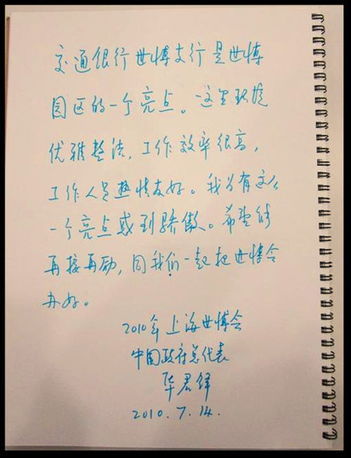 世博會中國政府總代表華君鐸在體驗世博支行服務后,留言鼓勵:“交通銀行世博支行是世博園區的一個亮點”。