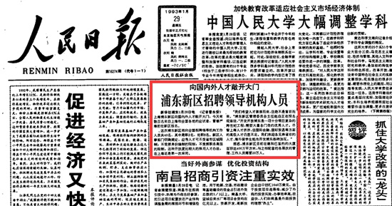1993年1月29日,《人民日報》在頭版對浦東面向全國公開招聘領導機構人員進行了報道