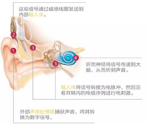 植入內耳的電子耳蝸,外表上看有點像主持人使用的“小蜜蜂”。該裝置分兩為部分——外部的語言處理器捕獲聲音,將其轉化為數字信號;通過手術植入的內部接收器(植入體)將信號轉化為電脈沖,聽覺神經再將信號傳遞給大腦,從而聽到聲音。