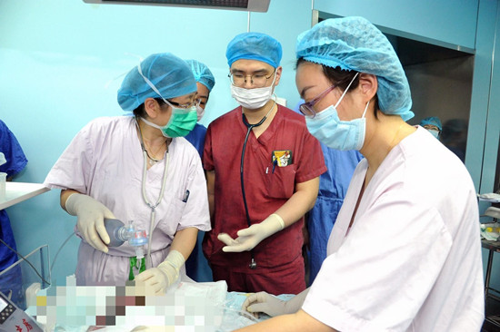 緊接著,由張羽主刀,在全麻下為患者施行了剖宮產手術。15:02分,孩子順利出生了,體重為3560g。早已在手術室嚴陣以待的上海兒童醫學中心新生兒搶救團隊與仁濟醫院醫護團隊通力配合,為新生寶寶進行了初步復蘇,很快就聽到了寶寶的第一聲啼哭。隨后,寶寶在搶救團隊的監護下,順利地經轉運暖箱車轉至兒中心新生兒重癥監護室進一步診治。母女平安。