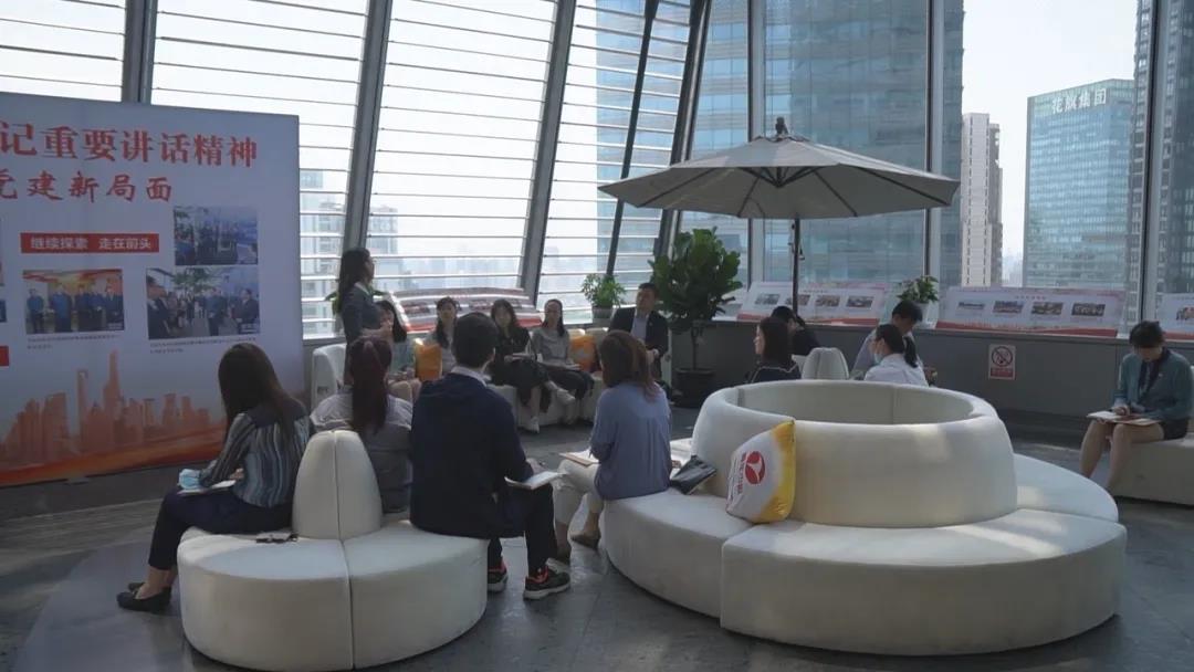 這是疫情發生以來,陸家嘴金融城黨群服務中心第二場線下黨課。一周前的5月20日11點半,三三兩兩的黨員走進我國第一高樓上海中心22樓的陸家嘴金融城黨群服務中心,12點,十余位外資銀行的黨員,圍坐在空中花園的休閑沙發上,上起黨課。