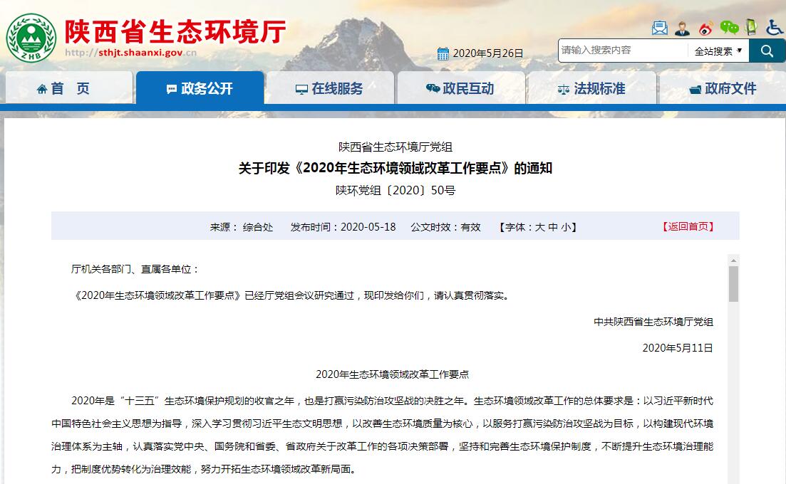 人民網西安5月26日電(谷妍) 2020年是實現全面建成小康社會和“十三五”規劃的收官之年,也是打贏污染防治攻堅戰的決勝之年。今年陜西生態環境改革工作怎么做?有哪些重點任務?近日,陜西省生態環境廳印發了關于《2020年生態環境領域改革工作要點》通知,主要從加強飲用水水源地保護、健全生態環境損害賠償制度、深化生態環保綜合執法改革等方面提出了九項重點任務。