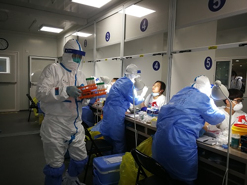 工作在緊張有序中進行著,在巡視中,我忽然發現沒有備用的采血試管,百密還是有一疏(如果第一次穿刺失敗,試管已經使用或是試管負壓不足就無法完成采集血標本),立馬和海關人員溝通,他們立即去流調處調用了一大包試管分發給每個點位。剛分發完,就發現有隊員開始使用備用試管了,心里一邊暗自慶幸,還好及時做好了補救,不然要手忙腳亂了,一邊告誡自己今后無論做什么事,都要考慮全面,特別要注重細節管理。