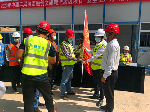 過去一年中,項目始終把安全生產作為“頭等大事”,做到了安全生產機構不削弱、安全工作基礎不動搖、安全技術標準不降低、安全生產管理不滑坡,實現了零安全事故。今年“安全生產月”的主題是“消除事故隱患,筑牢安全防線”,啟動儀式上,酒店區項目經理邵華為安全生產工作先進班組和個人頒獎,并為農民工安全督察隊授旗。通過表彰和授旗,將安全生產責任層層傳導,實現全員履責。