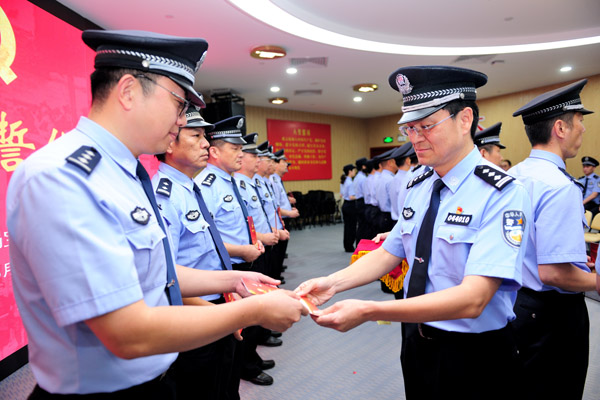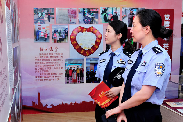 活動中,寶山分局政治處主任馬其忠為10年、20年、30年黨齡的老黨員頒發了“黨齡生日卡”,老黨員為新黨員集體佩戴黨徽,全體黨員代表集體進行了入黨宣誓。宣誓后,黨員民警參觀了“抗擊新冠肺炎”主題圖片展。