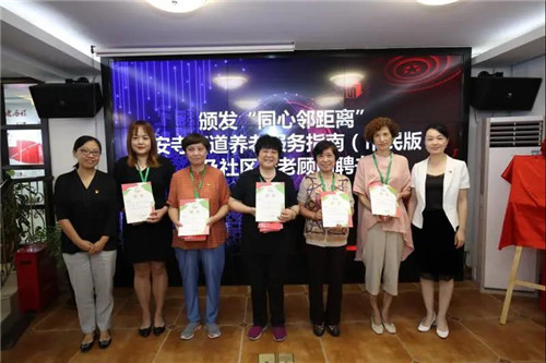 同心鄰距離《靜安寺街道養老服務指南(市民版)》正式發布,“同心鄰距離”——社區養老(樂齡)顧問團隊正式成立。街道黨工委副書記汝熙玲、街道辦事處副主任李蕓共同為顧問團隊發放聘書。