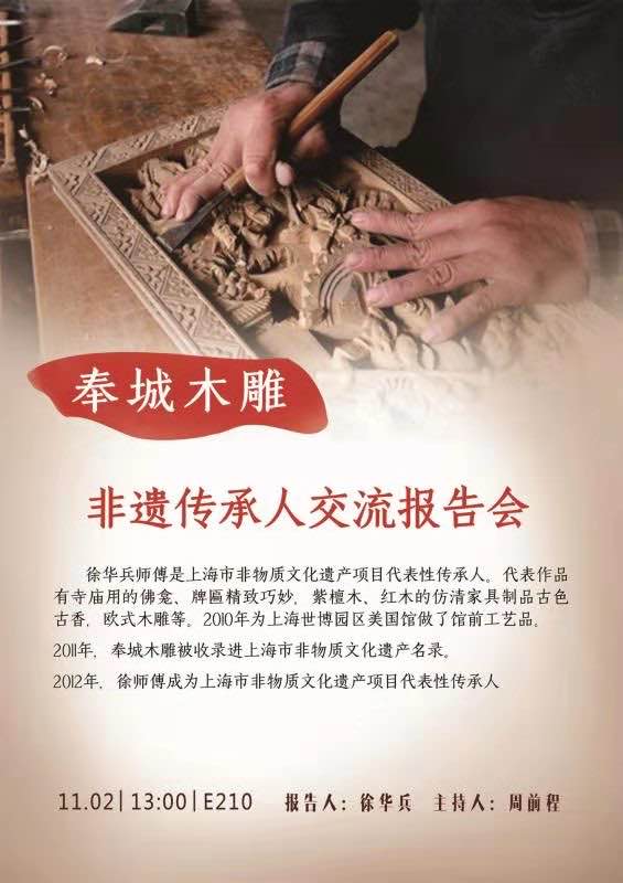 “奉城木雕”非物質文化遺產具有深刻的中華文化符號價值及社會和諧價值,透射著中華文化的博大精深。在師生的學習、練習、交流中,傳承人徐華兵師傅不僅用耳熟能詳的傳統動植物圖案,啟發同學們的創作思維,還手把手的教同學們把內心所想快速塑造出來,通過木雕作品細心打磨,同學們不僅能暫時忘掉浮躁的情緒,找到內心的平靜,還能通過木雕作品,建立自信心,浸潤文化活動的精神養料,有的學生甚至找到未來的職業生涯方向。2019年,徐華兵師傅指導劉晴等同學的《偶堂-木藝工作室》,獲得第五屆中國“互聯網+”大學生創新創業大賽上海賽區銀獎。