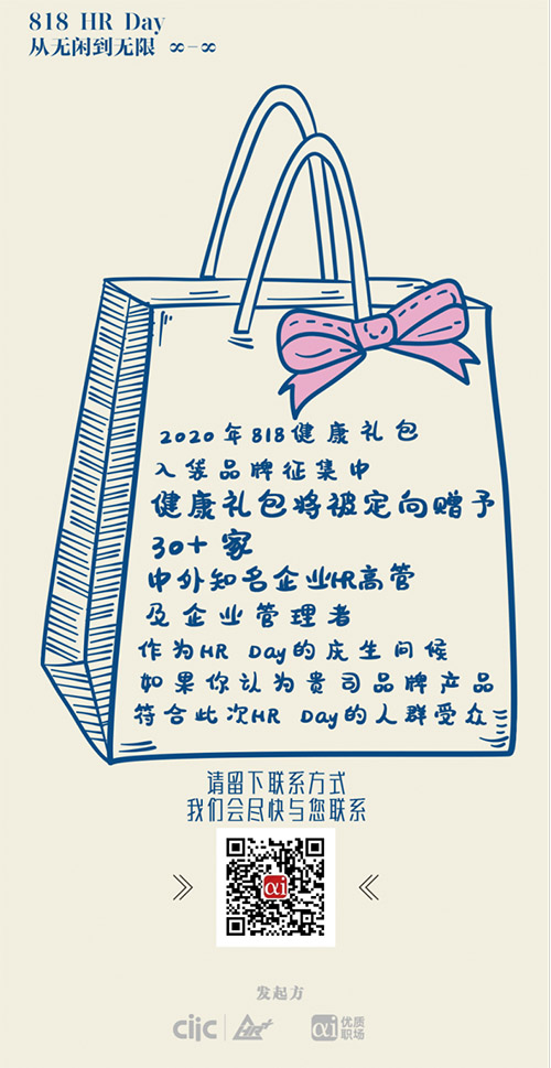 如果貴司品牌產品符合今年 818 進企業活動的市場訴求,恭喜你,請盡快與我們聯系。將你的品牌入駐 2020 年“818 健康禮包”吧!讓你的品牌成為更多HR高管和企業管理者的“座上賓”順利“出圈”,晉升為HR圈的“團寵”!