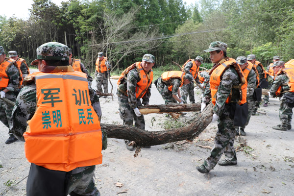 崇明民兵清理搬運路面倒伏樹木(李成攝)