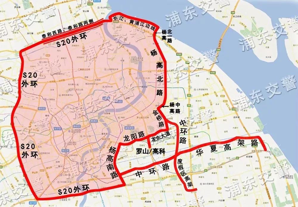 沿外環隧道(含兩側地面泰和路)-S20外環高速公路(外環隧道以西至楊高南路立交橋,含兩側地面泰和路、泰和西路至顧太路)-楊高南路-龍陽路立交-龍陽路-龍東大道-金橋路-金橋立交橋-楊高中路-楊高北路-楊高北一路以及長江邊線、黃浦江邊線所圍合的區域(含上述道路)。