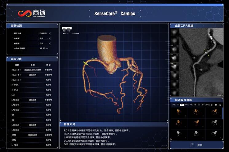 作為心血管疾病診斷的重要手段,心血管CT造影檢查(CTA)需要醫生對冠脈CT圖像進行復雜的三維重建以判斷斑塊狹窄等情況,單個病例的診斷從醫生開始閱片到出具報告需要耗費20~30分鐘。SenseCare心臟冠脈智能臨床解決方案依托商湯領先的AI算法,結合多種三維可視化與交互技術,可自動完成心臟分割、冠脈分割、中心線提取等三維重建、斑塊量化分析、以及自動生成膠片和結構化報告,整個流程僅需約1分鐘完成,全方位提高了心臟冠脈診療的效率及完備性,降低醫生的負擔。