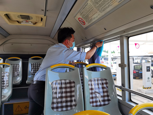 在大橋三線公交車內,駕駛員徐凱正在用高壓噴壺噴出空調口內的灰塵,隨后進行全方位清洗消毒。巴士一公司六車隊隊長劉杰介紹說:“對于公交車來說,空調出風口相當于人的‘鼻子’,定期清除附著在空調出風口上的病菌,車內空氣才能保持清新,F在車輛行駛需要開窗通風,空調濾網和出風口更容易積壓灰塵,時常清潔,保障車內空調通風順暢。目前,我們在保證線路每日一次消毒工作的同時,還會一周二次對空調主出風口及空調濾網、空調出風口進行消毒擦拭,讓市民在夏季能夠安心乘車!