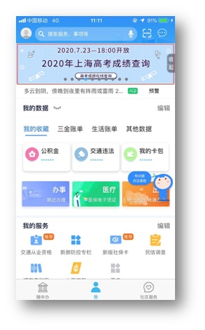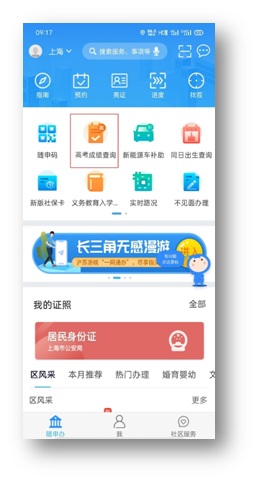 2、考生可在隨申辦APP通過以下流程查詢高考成績,兩種方式進入“高考成績查詢”服務: