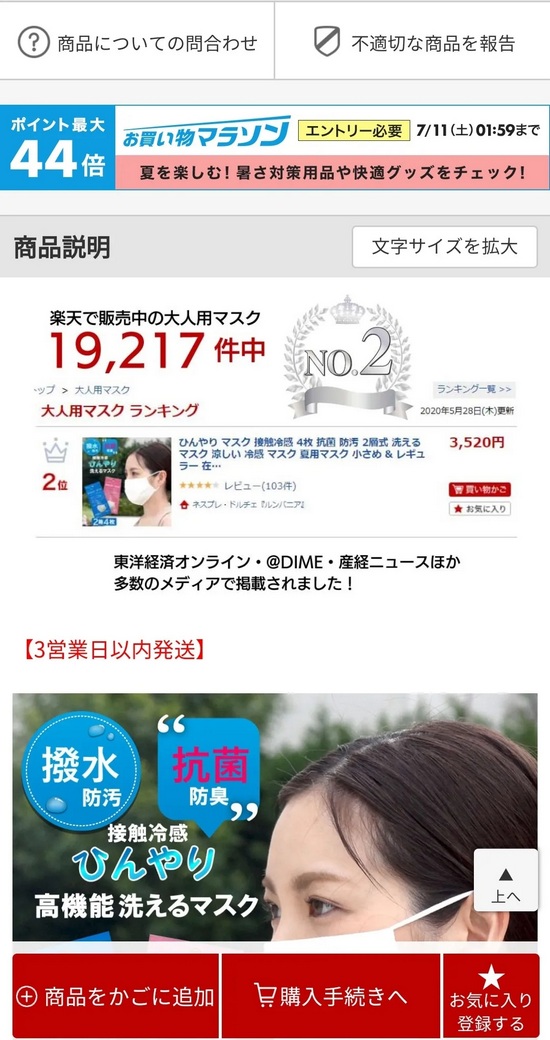 根據孔令璽提供的資料,5月28日,這款春夏涼感口罩在日本樂天網的銷量排名第二!5月份,在日本的街頭,有兩位中老年人戴著口罩悶死了,當天日本八個電臺24小時滾動播報這條新聞。當天下午2點,有個記者發現了樂天網上有一款冷感口罩,看評價防護性、透氣性都很好,這條1分鐘的新聞播完后,我們網店里庫存的8萬只口罩瞬間被秒殺!睂Υ,孔令璽總結道,“市場需求一旦形成,產品如果確實有實力的話,那么銷量會非常給力!