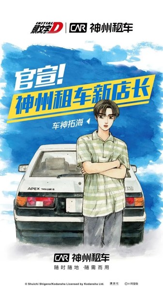 據神州租車相關負責人介紹,本次活動獲得了頭文字D漫畫的官方授權,漫畫主人公藤原拓海這一虛擬人物成為了租車門店店長,為消費者提供各種優惠活動和服務體驗。而從7月下旬到十月中旬期間,神州租車也將陸續推出一系列主題優惠活動,包括價值86元的租車優惠券,以及頭文字D聯名襯衫的互動抽取等,消費者在此期間使用租車服務,更有機會親身感受這款賽車動漫的線下實體近距離體驗。