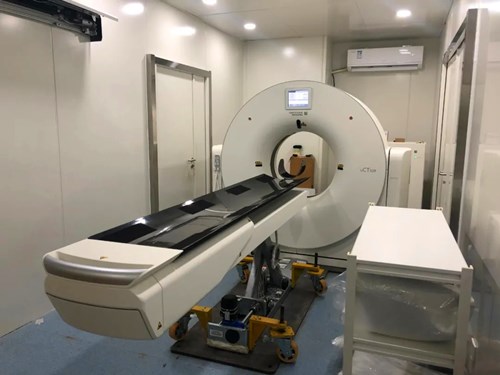 據悉,7月28日方艙醫院的艙體和CT設備送達醫院,經過兩天緊張的裝機調試、放射防護檢測及人員培訓后于7月30日下午投入試運行。這個占地約30平米的“大箱子”不需要進行場地裝修改造,2—3天即可快速拆裝及運輸轉移,且插電即用,其具有防水、隔熱、四季恒溫的特點,能夠適應各種環境。