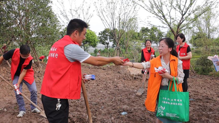 崇明桃源村中,志愿者們正在為市民公園景觀提升改造項目忙碌著。當地團委干部從青年中心帶來鹽水棒冰和酸奶,給田間村頭的志愿者們送上一份清涼。