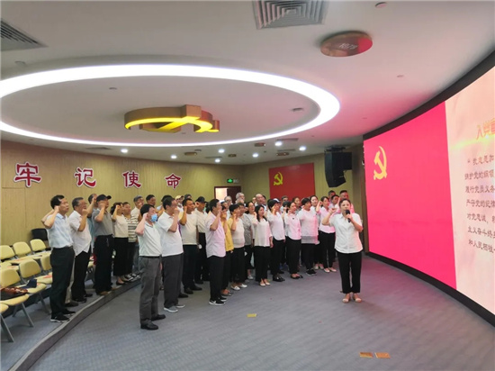 主題黨日,黨日姓“黨”,講黨性是第一原則,中心把“重溫一遍入黨誓詞”作為環節之一,突出活動的莊重感和儀式感,讓濃厚的“黨味”始終貫穿黨員學習教育活動過程!拔抑驹讣尤胫袊伯a黨,擁護黨的綱領,遵守黨的章程,履行黨員義務……”各級黨員干部面對鮮紅的黨旗,排列整齊,高舉右手,莊重宣誓,整個組織活動室,回響著鐫刻著信仰的聲音,錚錚有力的誓言,表明了每一位黨員積極接受黨性熏陶,矢志不渝地堅持理想信念的人生選擇。