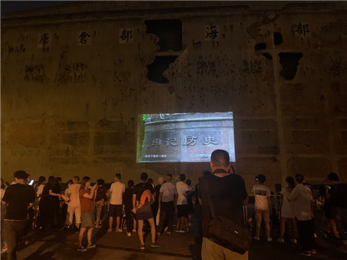 當晚,北站街道在四行倉庫廣場上露天播放《淞滬會戰》等影像,影像以四行倉庫的布滿彈痕的墻面為背景,使虛擬與現實,歷史與現代通過電影交織融合在一起。
