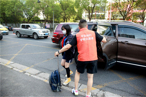 “平安閔行護校志愿者”正在快速引導送學車輛