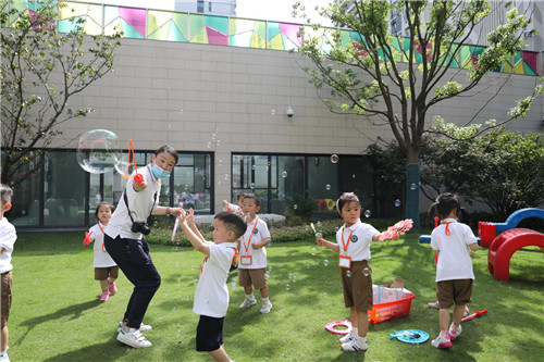 在大課程體系的引領下,幼兒園的每一個微課程也做到精益求精。9月份的迎新活動,為了緩解托小班新生的分離焦慮問題,幼兒園精心策劃了一系列活動,提前做好了全方位的“防御”準備。有前兩周的“循序漸進式”來園模式:實行“隔天來園”、“隔天午睡”、“持續全天來園”等遞進式心理調適方式;還有“玩轉幼兒園”快樂游戲周:設計“釣釣樂”、“吹泡泡”、“游樂場”、“拖拖樂”、“小劇場”等游戲情境,盡可能轉移幼兒注意力,引發快樂的情緒體驗,幫助孩子逐步適應新校區、適應幼兒園生活。此外,幼兒園每個新班還配備充足的人力保障,所有行政班組進班協助,確保開學工作安全、穩定、有序開展。