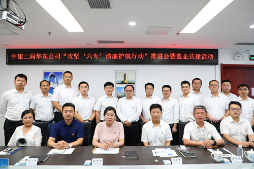 8月21日下午,中建二局華東公司山東分公司舉辦“攻堅‘六!辶o航行動”推進會暨監企共建活動,山東省紀委黨風政風監督室調研員張夢柳,局紀委書記鄧小林,局總經理助理、機關黨委書記、“六專行動”第一督導組組長孫衛東等出席活動。華東公司黨委副書記、紀委書記、紀檢監督工作部相關人員,山東分公司領導班子、黨員及職工代表參加現場活動,8個項目的班子及關鍵崗位人員通過視頻方式參加活動,本次活動共計參與人員112人。