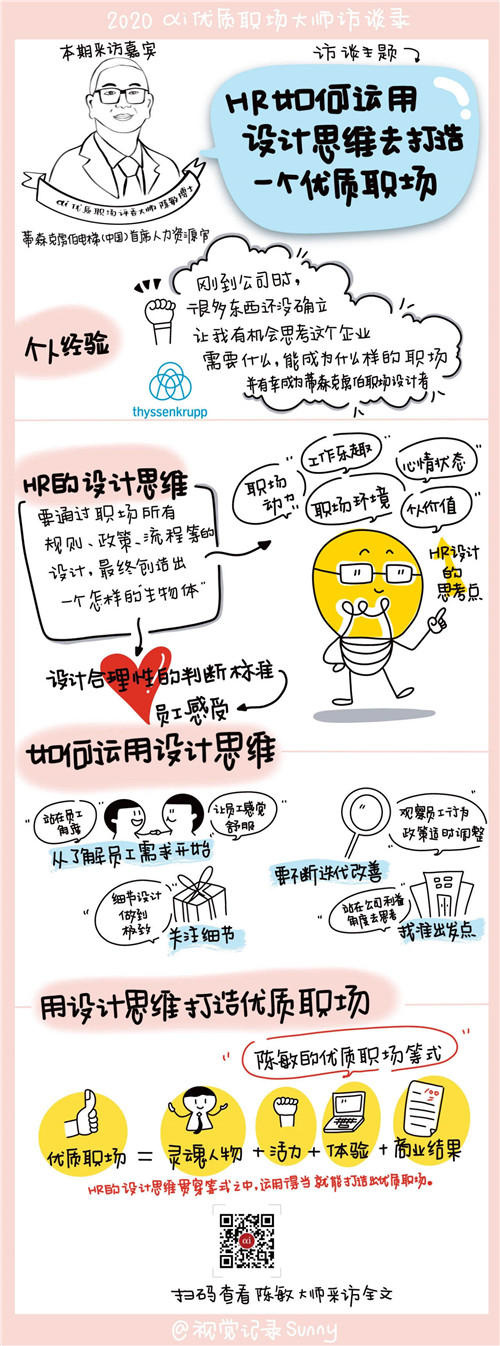在蒂森克虜伯,他就強調把細節設計做到極致。比如和潛在候選人接觸,從第一次電話到后續的一系列安排,溝通、交流、環境、布置、安排等都要讓這個候選人覺得“我喜歡”,這個公司有格調。比如員工入職第一天,要盡量縮短入職陌生感的時間長度,專門的員工服務中心專人引導,簡單易用的線上系統上的 CHRO 歡迎講話,部門的學習內容,所有需要了解學習的文件視頻觀看、打印、簽字,入職便輕松辦好了,員工感受就會很好。包括員工背調,也設計的十分周詳,背調的原則、不同級別人員的對接安排、背調涉及的信息范圍等,細致到每個問題的標準回復、員工離職表格上的二維碼,給員工方便,讓員工在與不在都能感覺這是家好公司,也讓需要接觸蒂森克虜伯的 HR——離職員工的潛在雇主覺得這公司不錯。