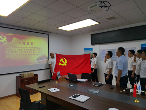最后,在支部書記的帶領下,宗先鵬同志面向黨旗莊嚴宣誓,其他黨員同志也重溫誓詞,他們目光堅定,牢記初心與使命。在黨旗之下,共產黨人的血液永遠炙熱,黨的旗幟永遠鮮紅。