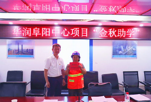 早在月初,華潤阜陽中心項目就對項目困難職工情況進行詳細摸排,發現項目工作業績突出的塔吊信號工家庭困難,女兒王倩倩今年考上安徽師范大學研究生,為緩解優秀職工家庭困難狀況,助力優秀學子圓夢大學,項目特地為張惠芳送來1000元慰問金,并為她女兒送來1000元夢想助學金。
