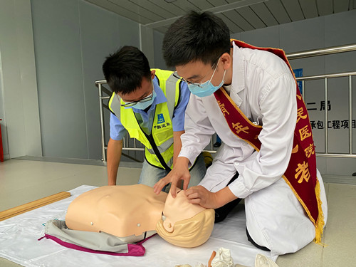 為進一步增強職工的自我保護意識, 幫助企業職工更好的掌握急救知識,提高職工們的自救和互救能力。近日,中建二局華東公司石家莊中央商務區項目工會支會邀請河北省人民醫院急診科醫護人員,結合工地特點為項目職工和工人代表開展了“生命護航”急救知識培訓及演練活動,本次培訓采用“多媒體教學+實操演練”相結合的方式進行。