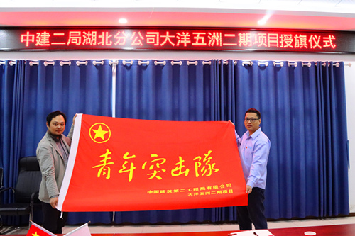 10月12日,在嘹亮的國歌聲中,中建二局湖北分公司大洋五洲二期項目黨員突擊隊、青年突擊隊授旗儀式拉開帷幕。